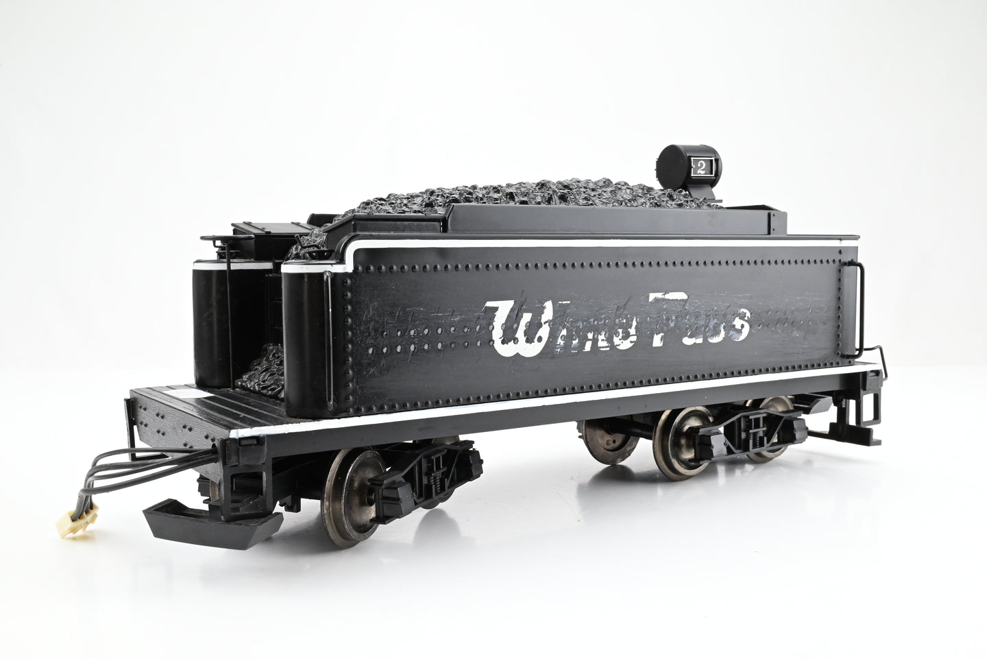- Condition: Good condition. Slightly dusty in hard to clean places. 'White Pass' lettering scratched off tender, some residual lettering on left side and scratch marks. Metal couplings rods.