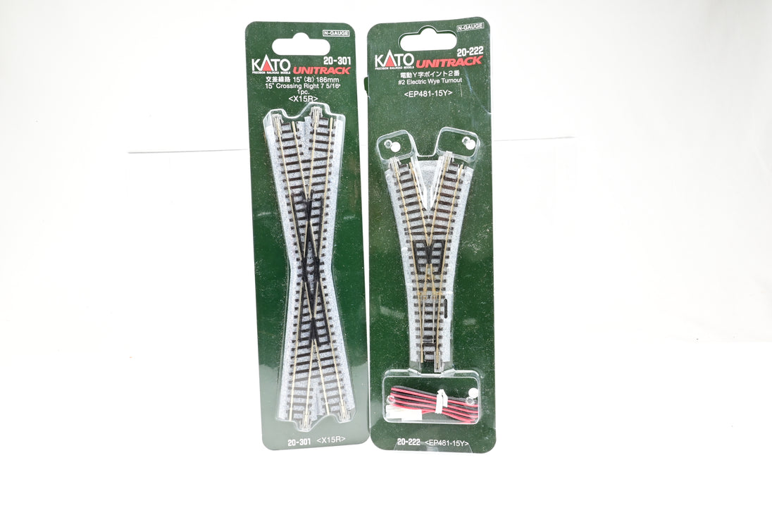 Contents: 1x 20-301 186mm 15 degree Crossing Right 7 5/16", 1x 20-222 #2 15 degree Electric Wye Turnout