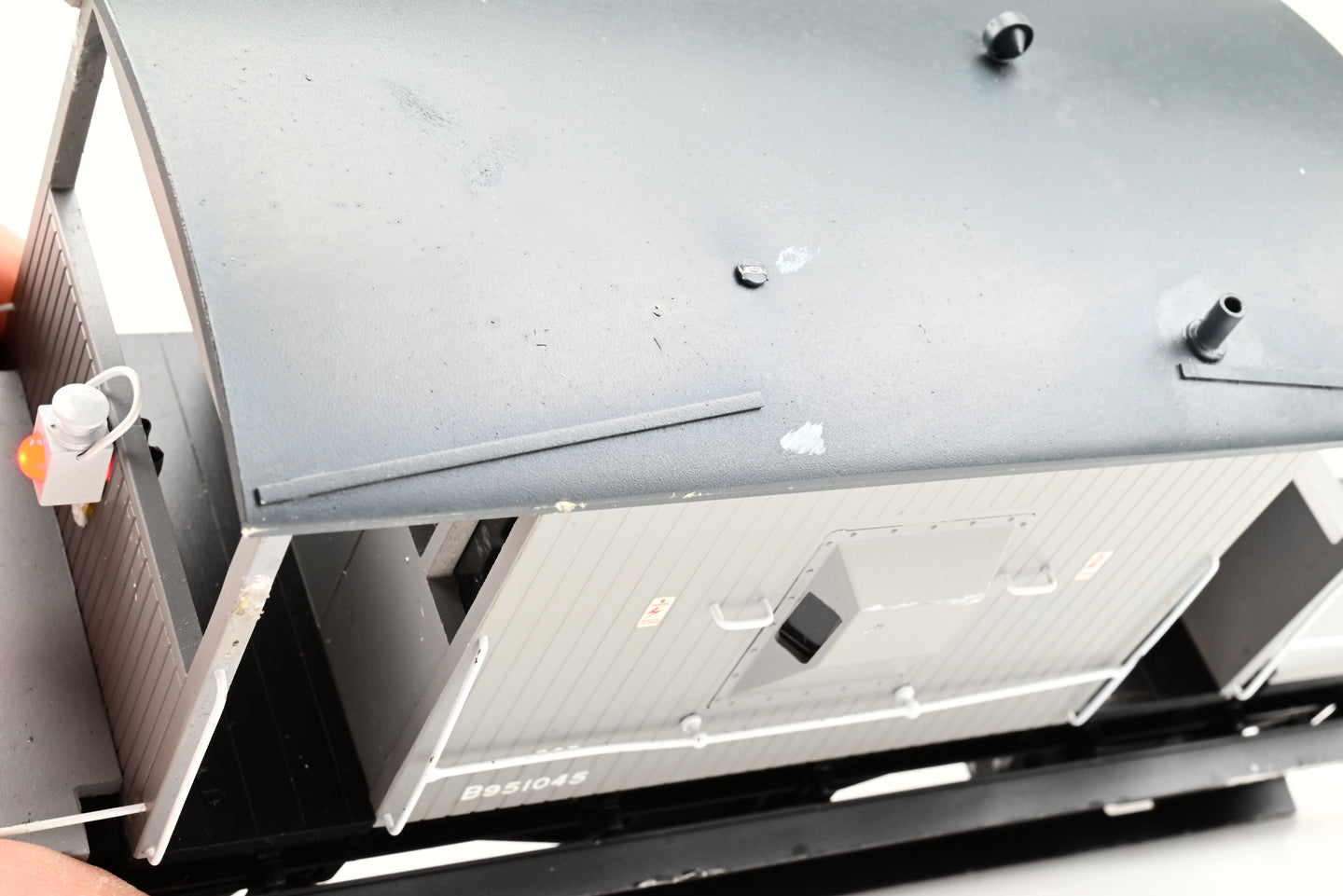 - Condition: Good condition. Working tail light. Missing several lamp irons and roof vent, marks on roof