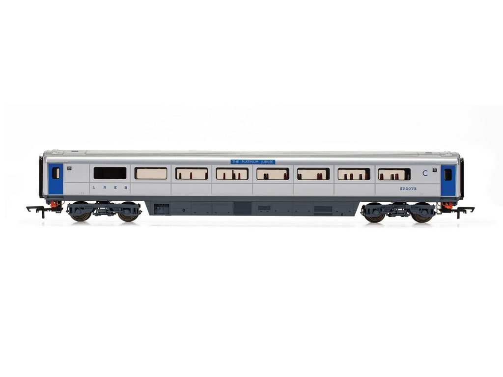Running with the Platinum Jubilee HST units, this coach reimagines what the ageing Mk3 coaches may have looked like in this celebratory Platinum Jubilee year under the old LNER. Full trains of these could have been used to commemorate such an occasion had nationalisation simply not happened. In a Platinum Jubilee silver with blue trim livery with re-purposed destination boards, the six First Class and two First Class Restaurant sliding door Mk3 coaches would indeed make a never to be forgotten image while being pulled along the East Coast Main Line at high speed. The sleek lines combined with more than a salute to the art deco style of the 1937 ÔCoronationÕ train, plus the wonderful opulence and style such a service offered, brings fanciful imaginings into reality, if only in model form. This coach is numbered ER0072, in celebration of the QueenÕs 20th year on the throne.