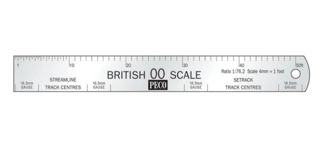 This stainless steel scale rule is a valuable tool for modelling in British 00 Gauge. It shows scale measurements from 3ins to 50ft, marked at 1:76.2 scale. It also includes markings for track gauge and spacing.