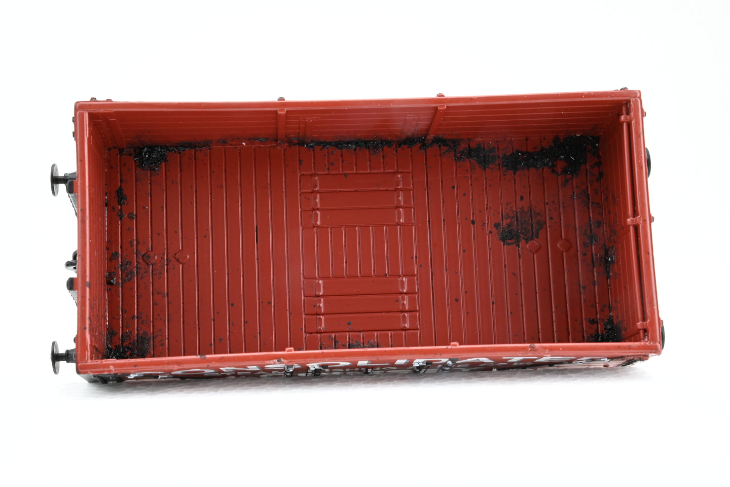 - Condition: Good overall condition, but has been well used - several small marks and signs of wear are visible around the body, there is some glue residue around the top rim, and there are the remnants of a load that has been glued inside the wagon (see close-up photos).
