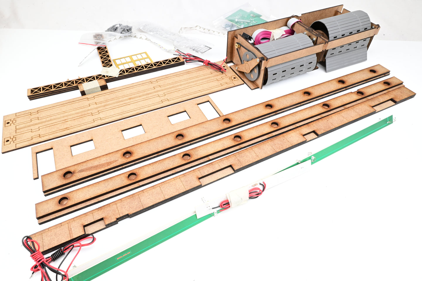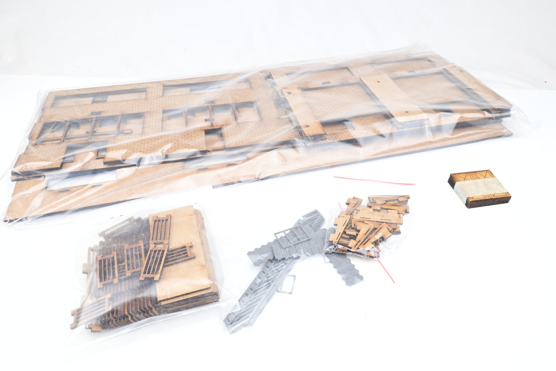 - Condition: This kit is complete and unbuilt, with all parts either still wrapped up or within their wooden frames ready to be popped out. Comes with full printed instructions, LED strip lighting and operating roller-shutter doors. The main body of the kit is laser-cut wood, with plastic sheets for glazing and all necessary electronics included, along with a control panel. The kit is unpainted and glue is required for assembly.
