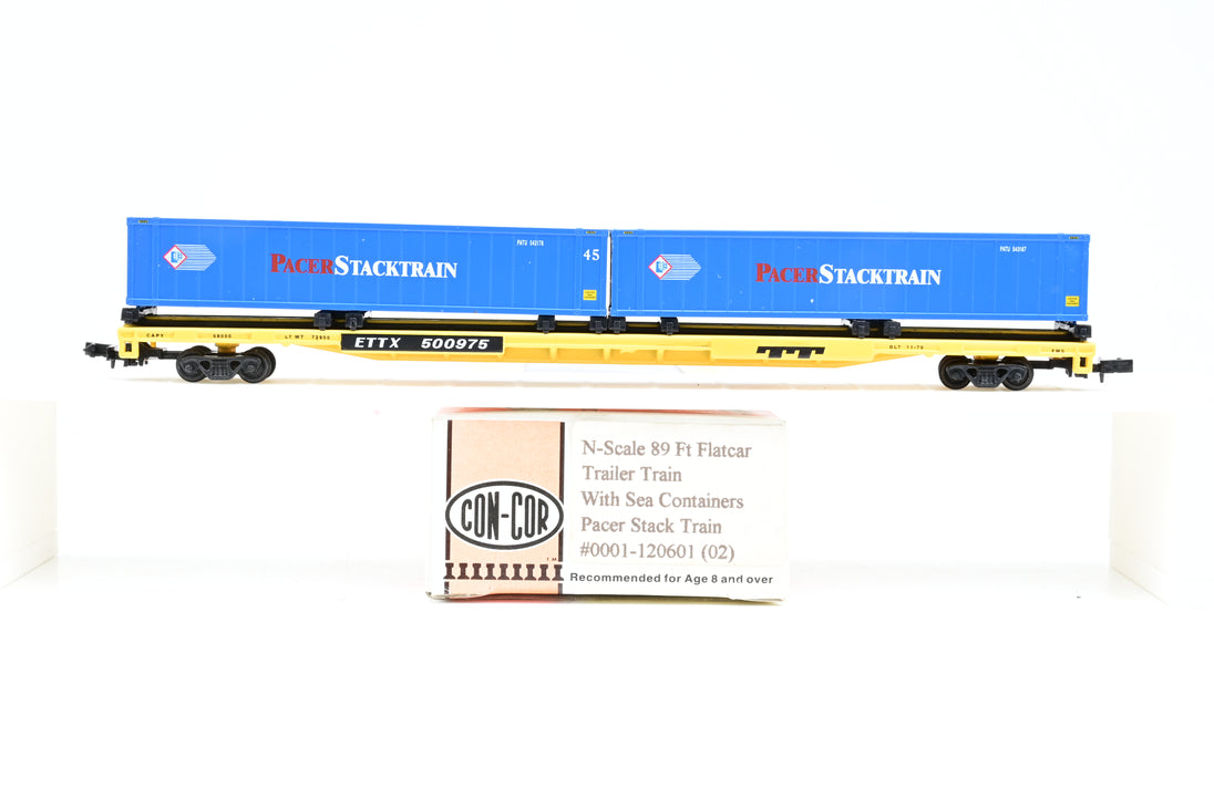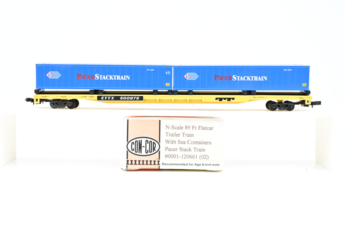 Con-cor N Gauge 89 ft Flatcar Trailer Train W/sea containers Pacer Stack Train #0001-120601