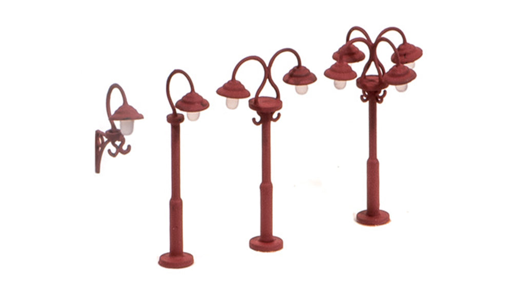 Includes 9 non working lamps with a selection or parts to make double or single standard lamps, or wall lamps. Glue and paints required to complete model. Height 46mm.